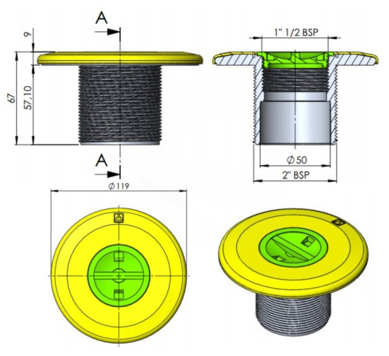 Priza dispune de filet exterior 2" pentru fixare și diametru interior Ø50mm pentru lipire în tubulatura PVC. Dopul filetat de 1½" cu garnitură asigură închiderea sigură când nu se utilizează echipamentele de curățare.