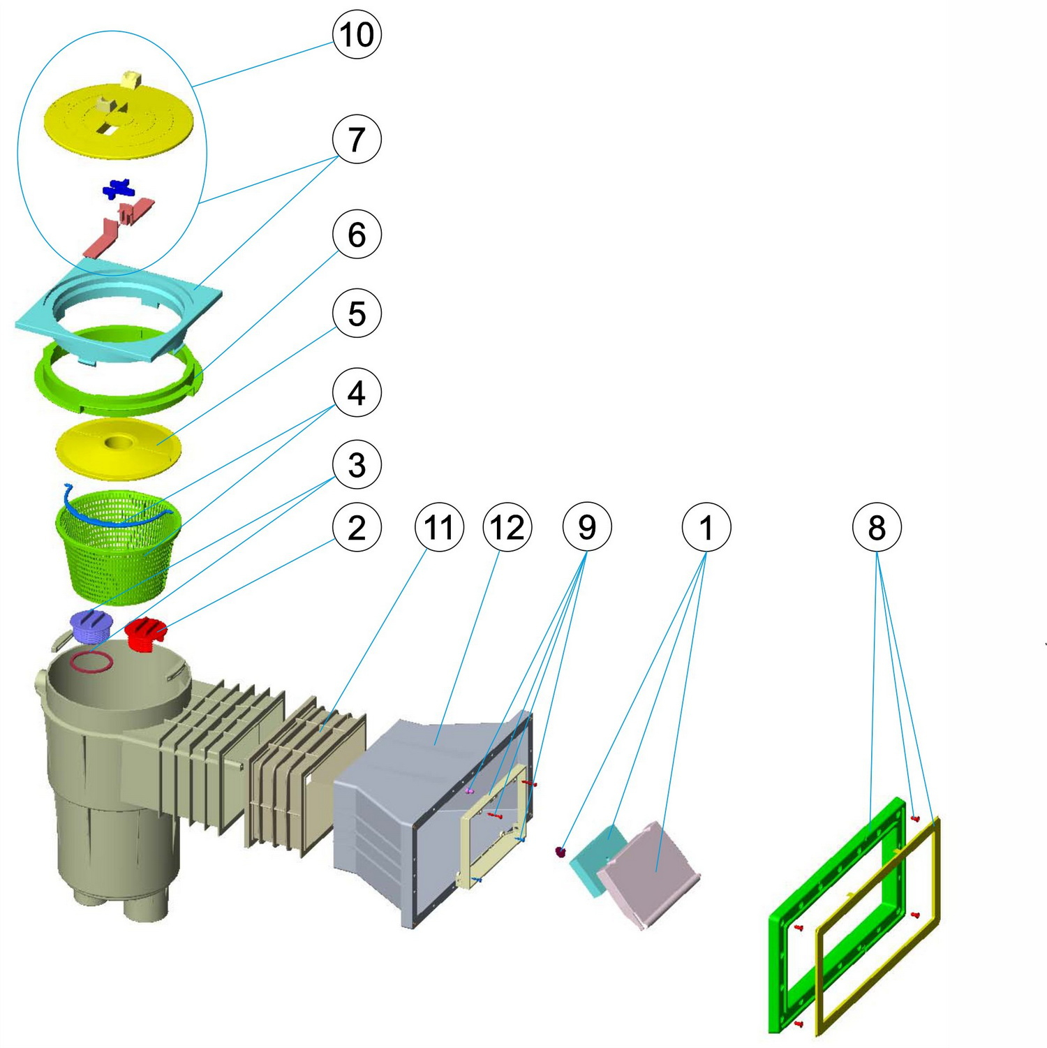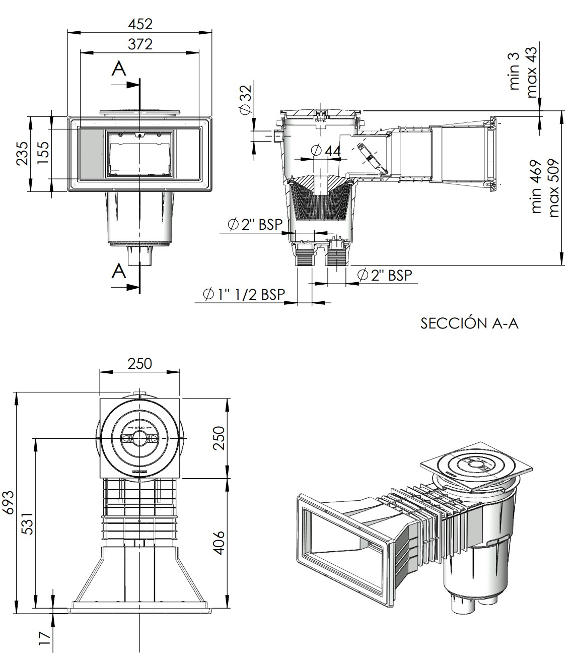 Coșulețul colector de impurități cu sistem de fixare prin baionetă facilitează golirea și curățarea frecventă, reținând eficient frunzele, insectele și alte particule în suspensie. Racordurile cu filet interior 1½" și exterior 2" asigură compatibilitatea cu majoritatea sistemelor de filtrare, iar conexiunea de supraplin Ø40mm protejează împotriva revărsării apei. Capacul pătrat cu inel de extensie pe înălțime se adaptează la diferite grosimi de pavaj sau suprafețe din jurul piscinei.