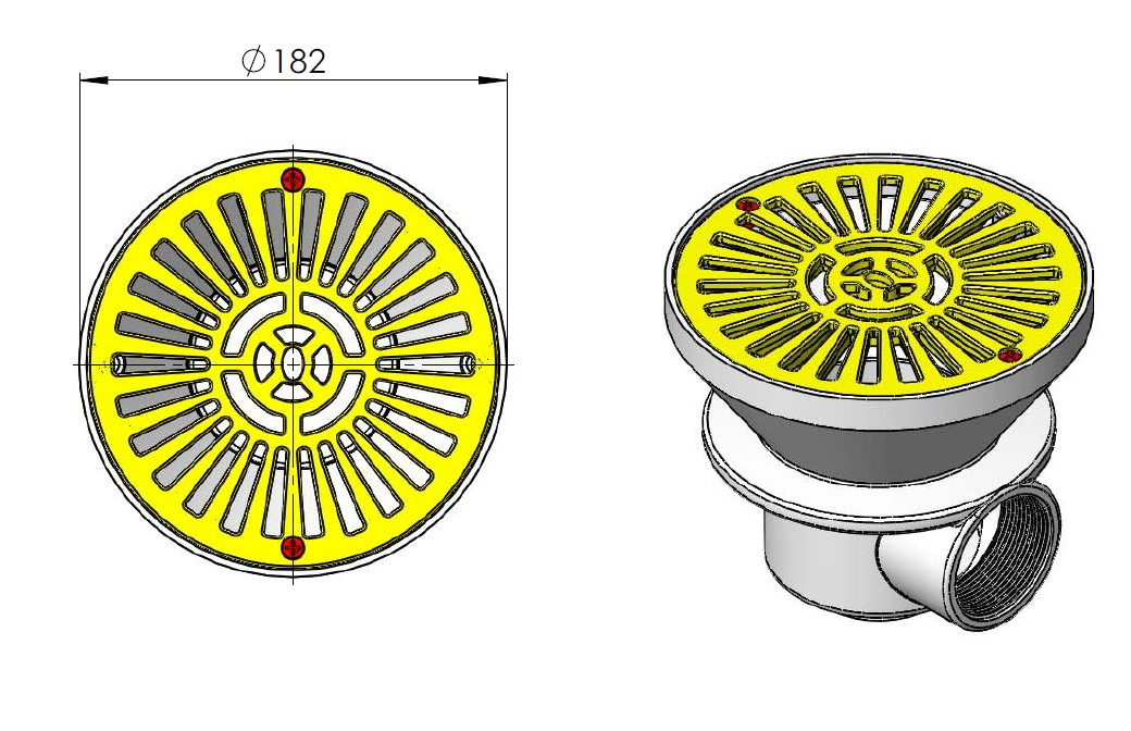 Grilajul radial Ø180mm distribuie uniform aspirația pe toată suprafața, prevenind formarea de vârtejuri periculoase. Viteza de trecere a apei prin grilaj este menținută la 0,5 m/s, conformă standardului EN 16582-1 pentru siguranța înotătorilor.
