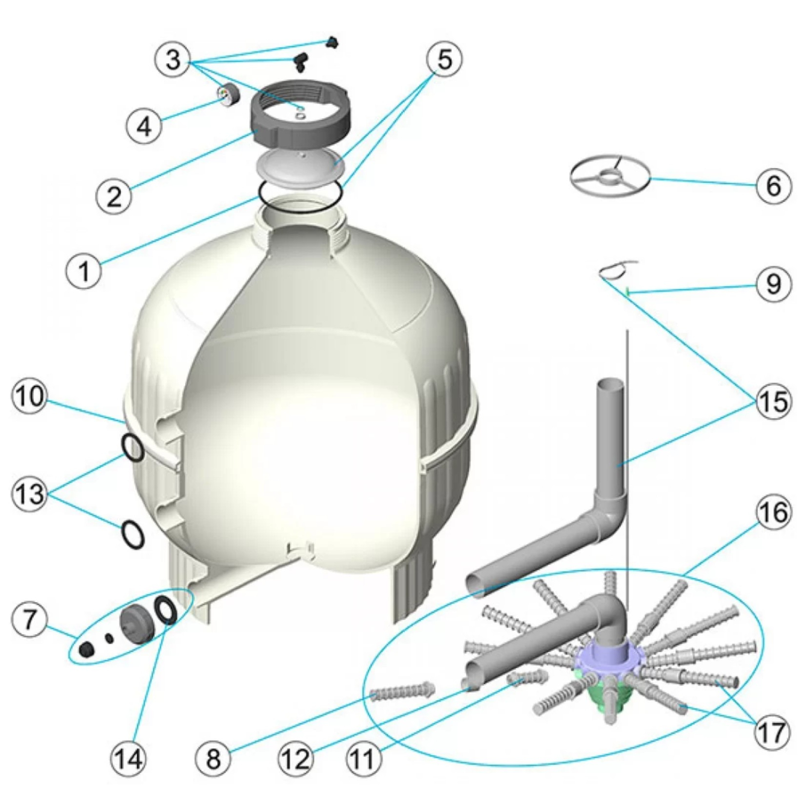 Dotări incluse Vană multiport 1½" cu 6 funcții, manometru, supapă manuală aerisire, ventil golire apă ¾", capac transparent policarbonat, bază integrată robustă cu orificii fixare multiple, colector inferior robust cu brațe multiple, difuzor superior