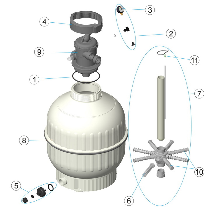 | Dotări incluse | Vană multiport 1½" cu 6 funcții, manometru, supapă manuală aerisire, ventil golire apă ¾", capac transparent policarbonat, bază integrată cu orificii fixare, colector inferior cu brațe, difuzor superior |